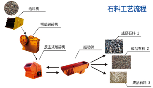 大塊石料經(jīng)料倉(cāng)由振動(dòng)給料機(jī)均勻地送進(jìn)鄂式破碎機(jī)進(jìn)行粗碎,粗碎后的石料由膠帶輸送機(jī)送到反擊式破碎機(jī)進(jìn)行進(jìn)一步破碎;細(xì)碎后的石料由膠帶輸送機(jī)送進(jìn)振動(dòng)篩進(jìn)行篩分,篩分出幾種不同規(guī)格的石子,滿足粒度要求的石子由成品膠帶輸送機(jī)送往成品料堆;不滿足粒度要求的石子由膠帶輸送機(jī)返料送到反擊式破碎機(jī)進(jìn)行再次破碎,形成閉路多次循環(huán)。成品粒度可按照用戶的需求進(jìn)行組合和分級(jí),為保護(hù)環(huán)境,可配備輔助的除塵設(shè)備。