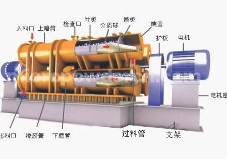 振動磨機由雙圓筒依靠聯(lián)接板固定成一體,聯(lián)接板上同時固定著激振器,且激振器需通水冷卻,雙圓筒由隔振彈簧支承,彈簧支座固定在不參振的底架上。由電動機通過撓性聯(lián)軸器和萬向聯(lián)軸器帶動激振器的軸旋轉(zhuǎn),激振器的軸上帶有偏心塊,由于帶偏心塊軸的旋轉(zhuǎn)使雙圓筒做近似的圓振動。筒體內(nèi)充填研磨介質(zhì)(鋼球或鋼棒)和待粉磨物料,物料既可從上圓筒的進(jìn)料口進(jìn)入,上圓筒內(nèi)粉磨完畢的物料流入下圓筒繼續(xù)粉磨,最后從下圓筒的出料口排出,即單進(jìn)單出;物料也可同時進(jìn)入上下圓筒進(jìn)行粉磨,然后同時排出,即雙進(jìn)雙出或雙進(jìn)四出。筒體做圓振動時,筒內(nèi)的介質(zhì)和物料在筒內(nèi)翻轉(zhuǎn),互相沖擊,這種有規(guī)律的翻轉(zhuǎn)、沖擊和介質(zhì)的自轉(zhuǎn),使物料在短時間內(nèi)得到粉碎,并達(dá)到理想的粉碎效果,圓筒筒體由外筒、內(nèi)襯筒和端蓋組成。內(nèi)襯筒是可更換的,由耐磨材料制成。 ZM系列振動磨的激振器由四組主副偏心塊組成,調(diào)整副偏心塊和主偏心塊的相位角,可改變激振力的大小,從而達(dá)到調(diào)整振幅大小的目的,振動磨雙振幅的近似值可以從振幅標(biāo)示牌上讀出。圓筒內(nèi)的粉磨介質(zhì)有鋼球或鋼棒兩種。相同直徑和級配的情況下,鋼棒做介質(zhì)時的產(chǎn)率要高于鋼球做介質(zhì)時的產(chǎn)率。因為用鋼球做介質(zhì)時,要達(dá)到同樣的粉狀粒度,粉磨時間較長,但鋼球做介質(zhì)時能達(dá)到更細(xì)的粒度。振動磨常用介質(zhì)為Φ16-Φ36mm的鋼棒,鋼棒應(yīng)經(jīng)過滲碳和淬火,表面硬度應(yīng)達(dá)到HRC55以上。入料粒度>15mm時取較大直徑,入料粒度<15mm時取較小直徑,并采用兩種不同直徑鋼棒的混合級配較好。