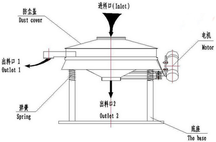 旋振篩起動后,其動力裝置即振動電機上下兩端不同相位的偏心塊、由于高速放置作用而產(chǎn)生一復(fù)合慣性力,該慣性力強迫篩機振動體作復(fù)旋運動,篩框在振動力的作用下連續(xù)作往復(fù)運動,進地而帶動篩面作周期性振動,從而使篩面上的物料隨篩箱一同作定向踴躍式運動,其間,小于篩面孔徑的物料通過篩孔落到下層,成為篩下物,大于篩面孔徑的物料經(jīng)連續(xù)跳躍運動后從排料口排出,完成精細(xì)篩分工作。