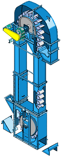 TB垂直斗式提升機(jī)采用板式套筒滾子鏈為牽引構(gòu)件,料斗固定在鏈板上并連續(xù)布置,用流入式裝載,低速重載卸料的斗提機(jī)。本機(jī)適用于輸送中等及大塊狀的、易碎的和磨琢性的堆積密度小于2t/m3的物料,物料溫度不超過(guò)2500C,如塊煤、礦石、卵石、焦碳等 。